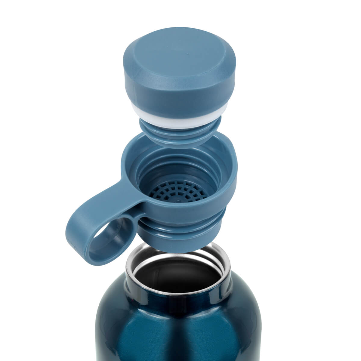 Termo doble pared, cerrado al vacío. Pared interna y externa de acero inoxidable. Incluye tapa de plástico con doble sistema de rosca, además de incorporar un filtro para preparar té o infusiones. Su asa integrada facilitará que los lleves a todos lados, además su acabado brillante y colores metalizados le dan un toque sofisticado, ideal para la oficina, el gimnasio o cualquier aventura. Mantiene temperatura caliente 6 hrs y temperatura fría 12 hrs. Capacidad 22 Oz. Incluye individual.