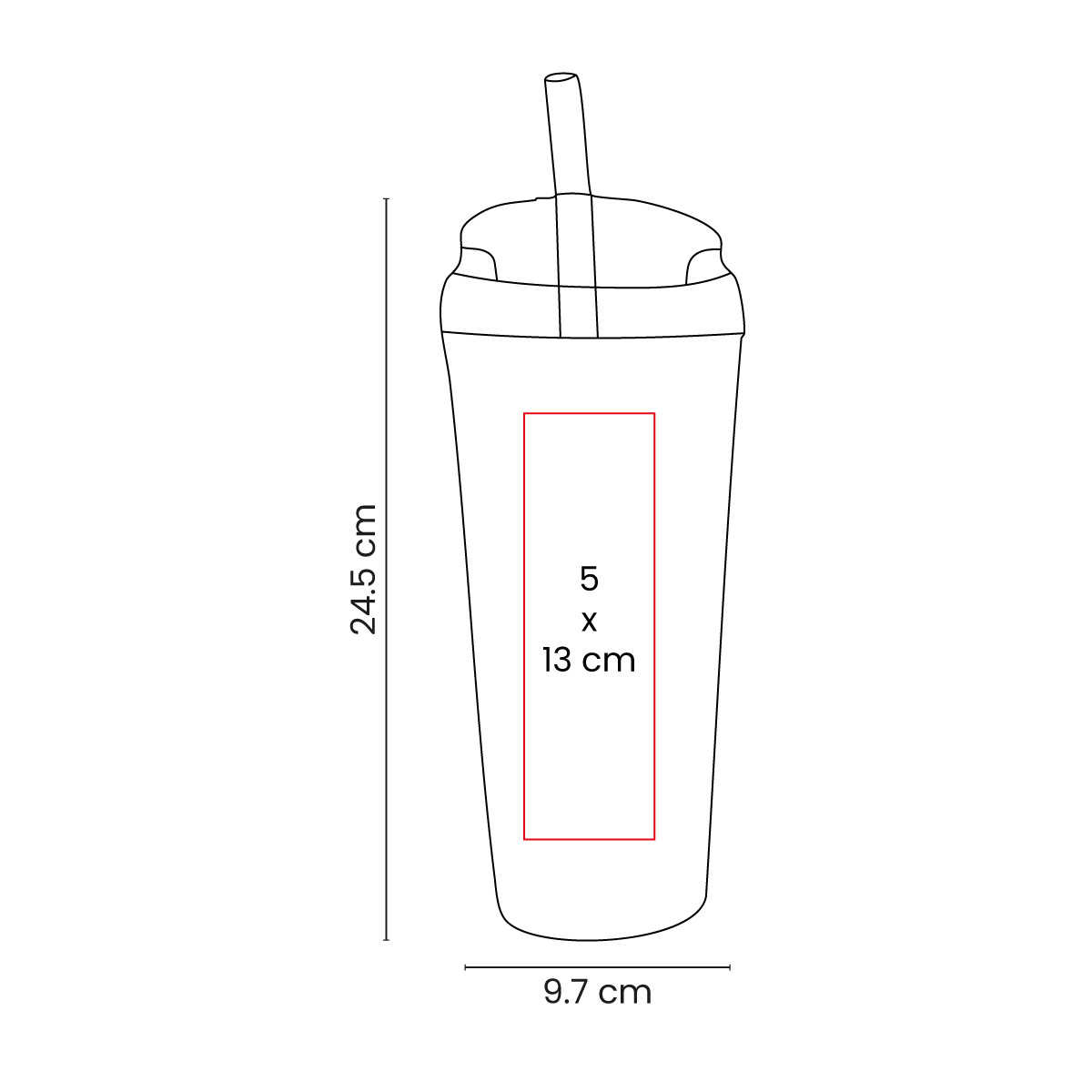 Vaso doble pared. Pared interna y externa de plástico. Tapa de plástico con sistema de rosca. Sobretapa con sistema push. Incluye popote. Cuerpo con terminado tipo rubber y degradado de color. Capacidad 24 Oz. Base de 7 cm de diámetro. Incluye caja individual.