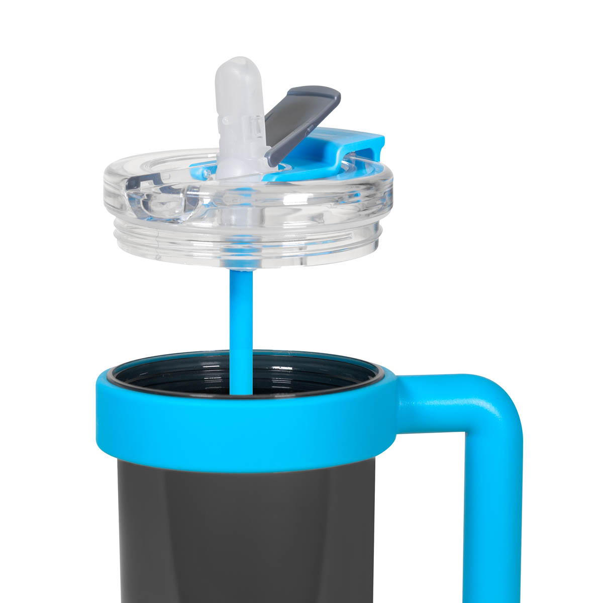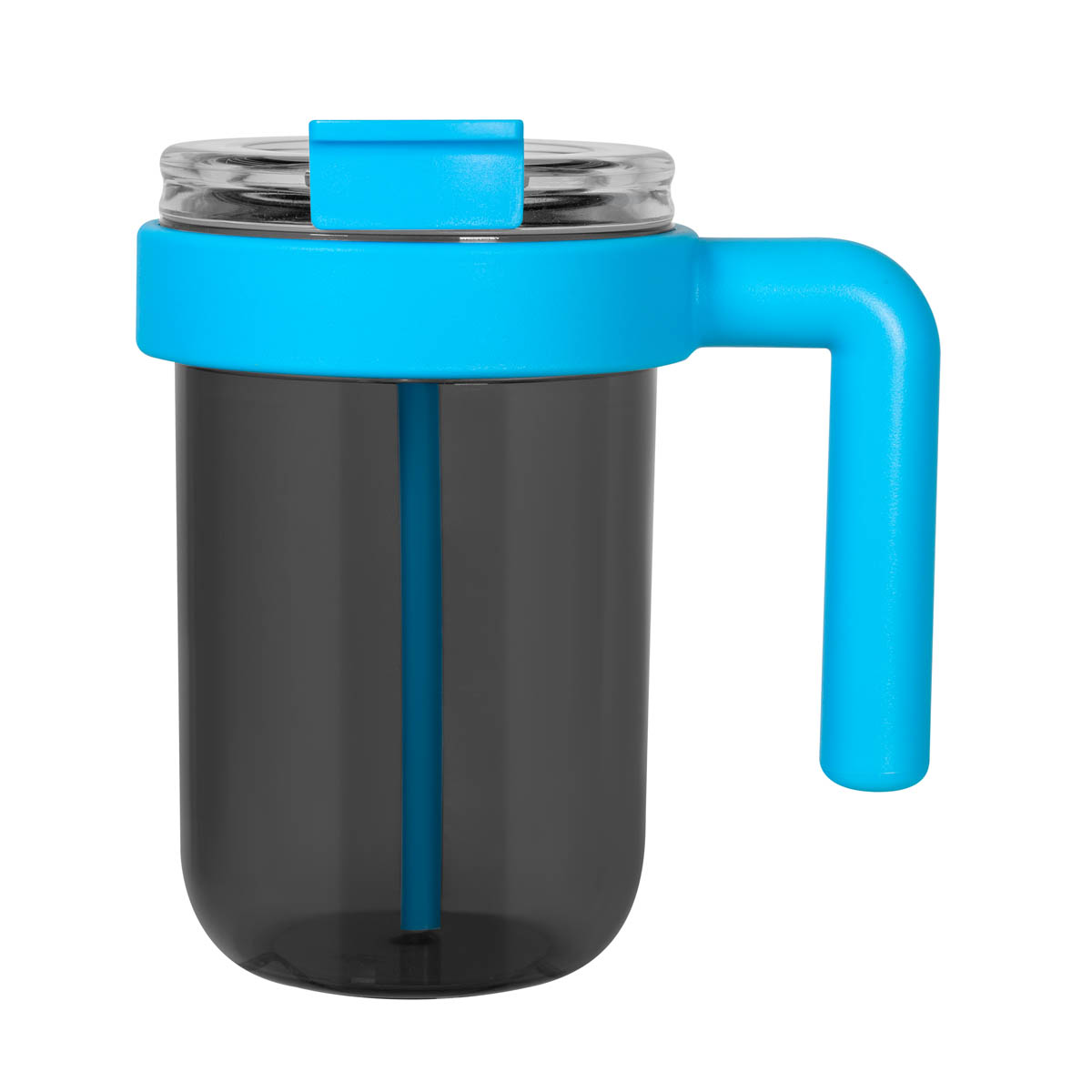 Termo de plástico de una pared. Tapa de plástico con sistema de rosca, sobre tapa con sistema de push y boquilla plegable con popote integrado. Es fácil de usar y perfecto para llevar en cualquier actividad. Su asa grande y ergonómica, permite un agarre más cómodo. Su combinación de colores, con un cuerpo oscuro translúcido y acentos en color sólido en el asa, popote y tapa, le da un toque moderno y atractivo. Incluye caja individual.