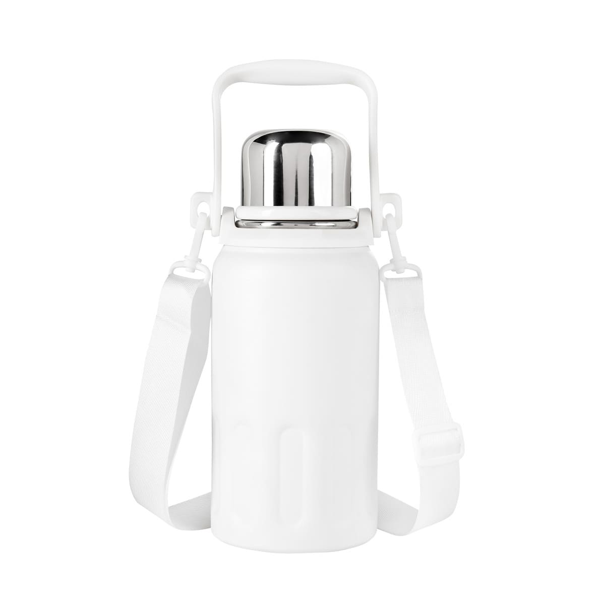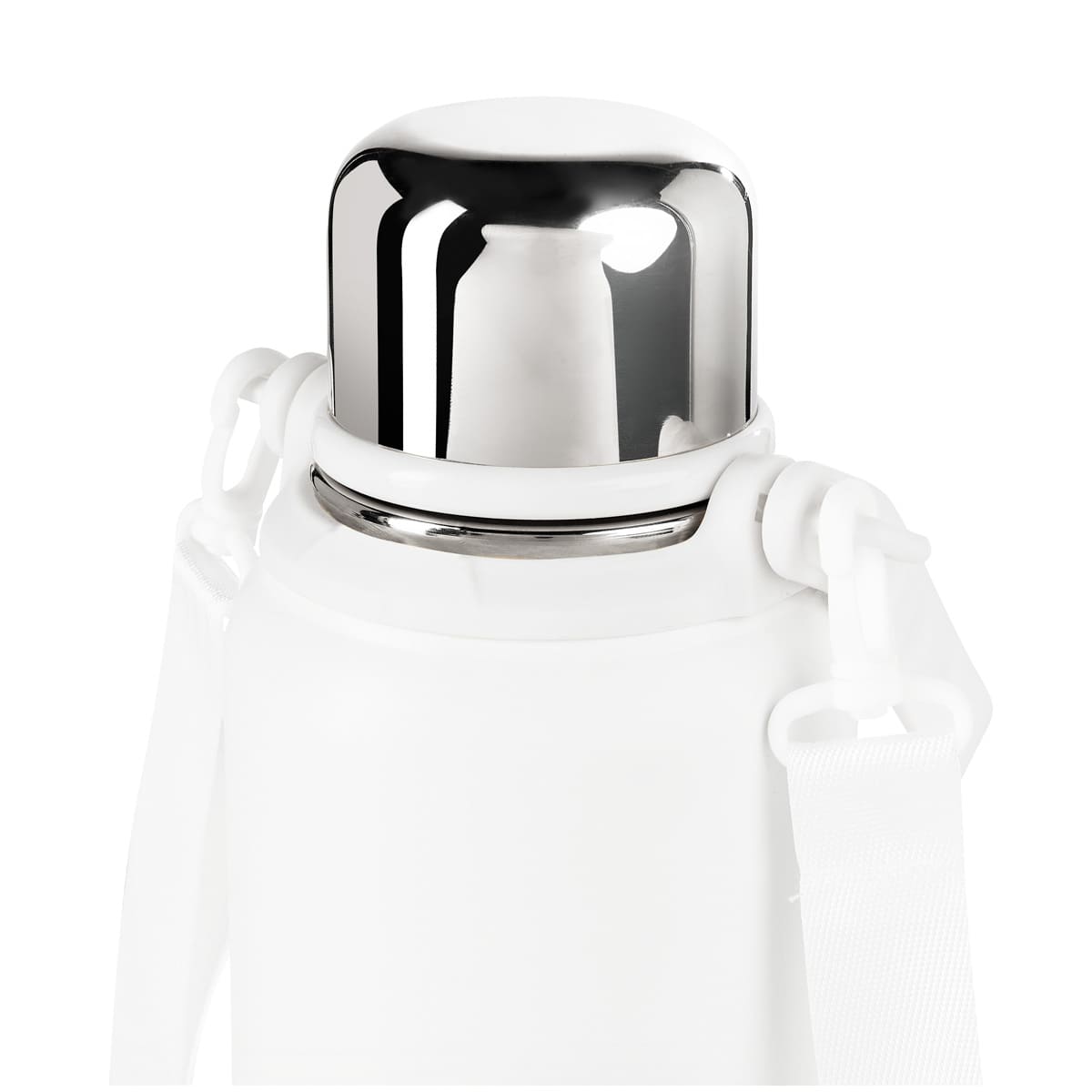 Termo doble pared. Cerrado al vacío. Pared interna y externa acero inoxidable y cuerpo con terminado tipo rugoso. Tapa de plástico con sistema de rosca, boquilla y botón de seguridad para mantener cerrado y sin derrames, incluye sobretapa metálica de rosca. Además, agrega un asa plegable de plástico y un asa de poliéster removible, que facilita su traslado. Mantiene la temperatura caliente por 10 hrs y la temperatura fría por 12 hrs. Capacidad de 40 Oz. Incluye caja individual.