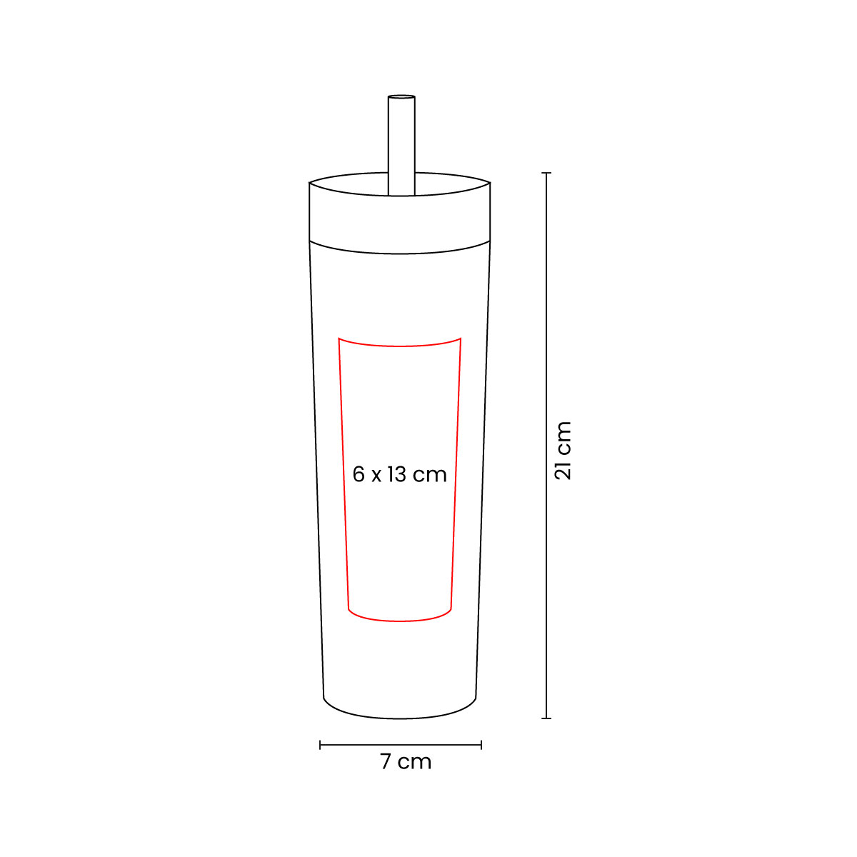 Doble pared. Pared interna y externa de plástico. Tapa de plástico con cierre a presión. Incluye popote y caja individual.