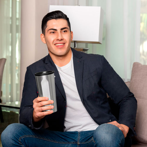 Doble pared. Pared interna plástico, pared externa acero inoxidable. Tapa de plástico con válvula de seguridad. Incluye caja individual.