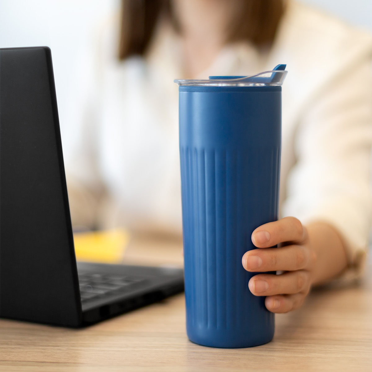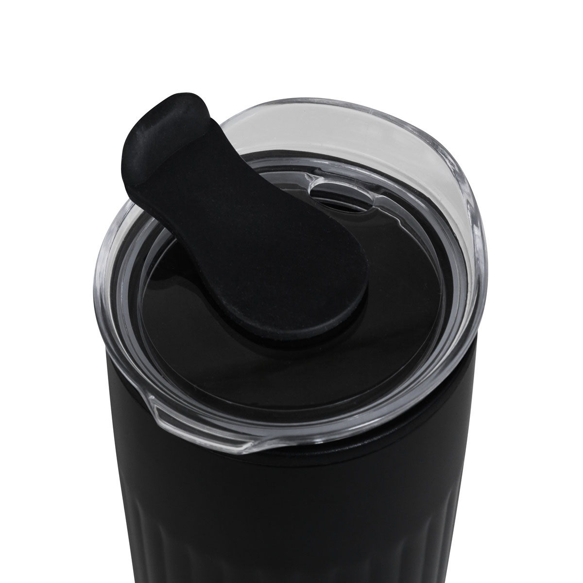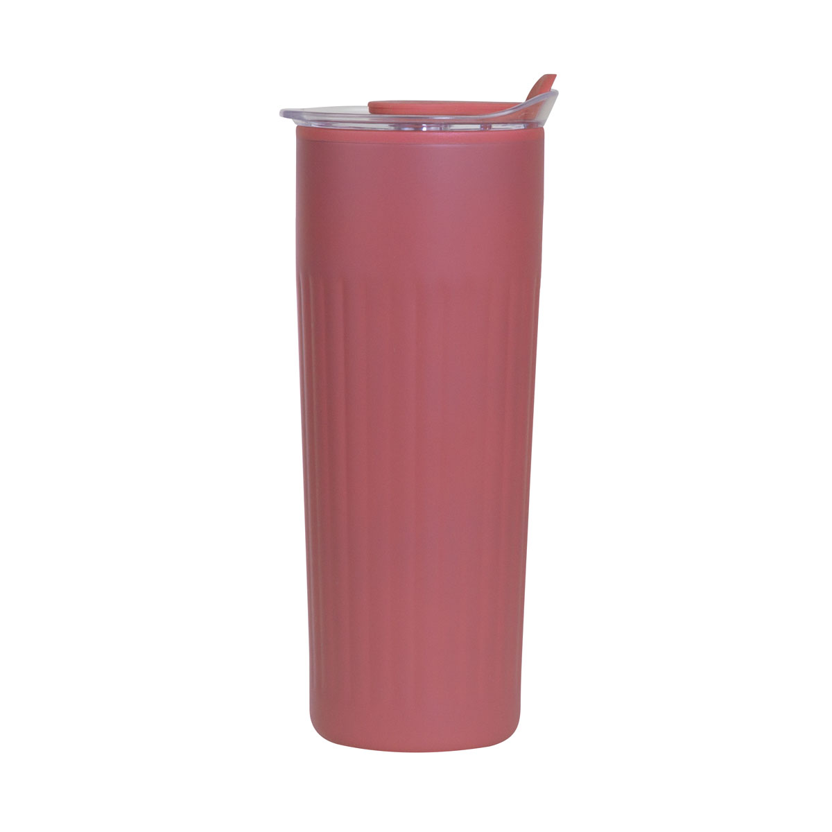 Doble pared. Pared interna de plástico, pared externa de acero inoxidable. Tapa de plástico con sistema de push. Sobre tapa de silicón movible. Incluye caja individual