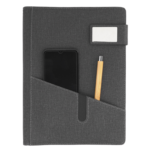 Carpeta de poliuretano con broche magnético y placa metálica, con porta papeles en la pasta, en el interior cuenta con porta tarjetas, 98 hojas rayadas y arillo metálico.