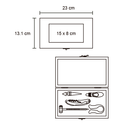 Set de vino con 5 accesorios que incluyen: Sacacorchos, boquilla, tapón para vino, termometro y corta etiquetas.
