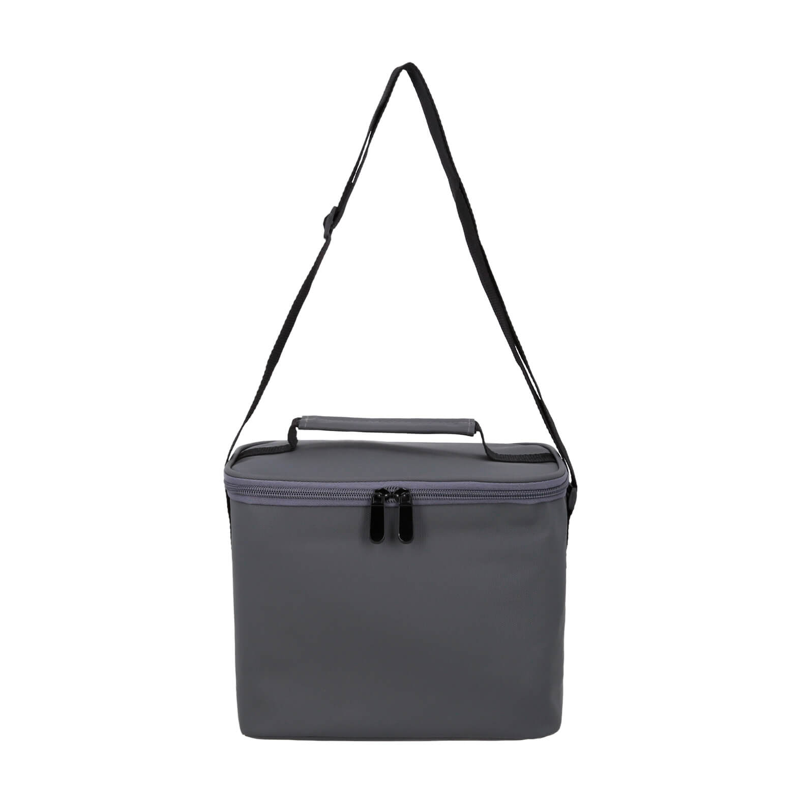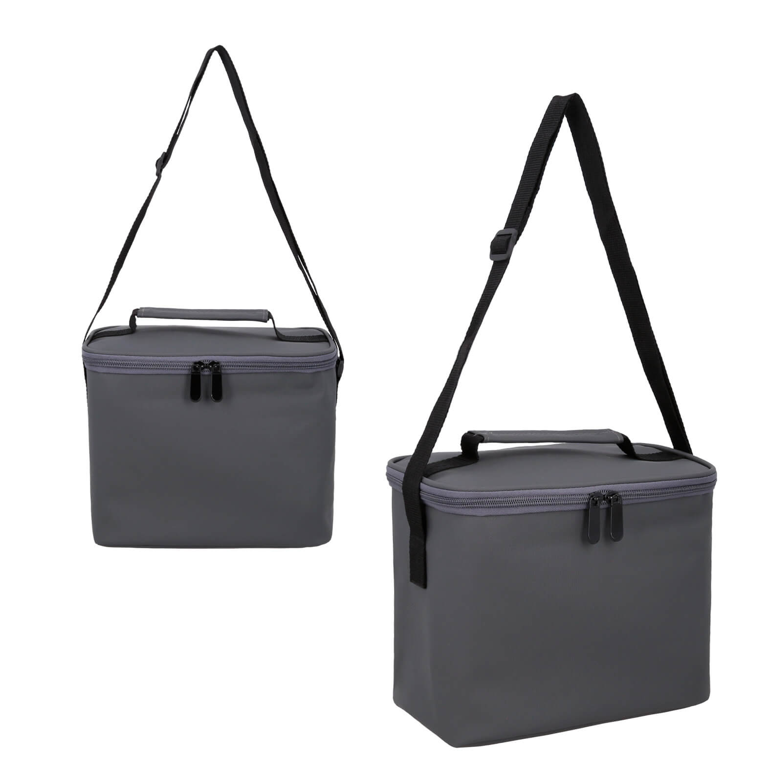 Lonchera con interior térmico de doble cierre, correa ajustable y asa superior.