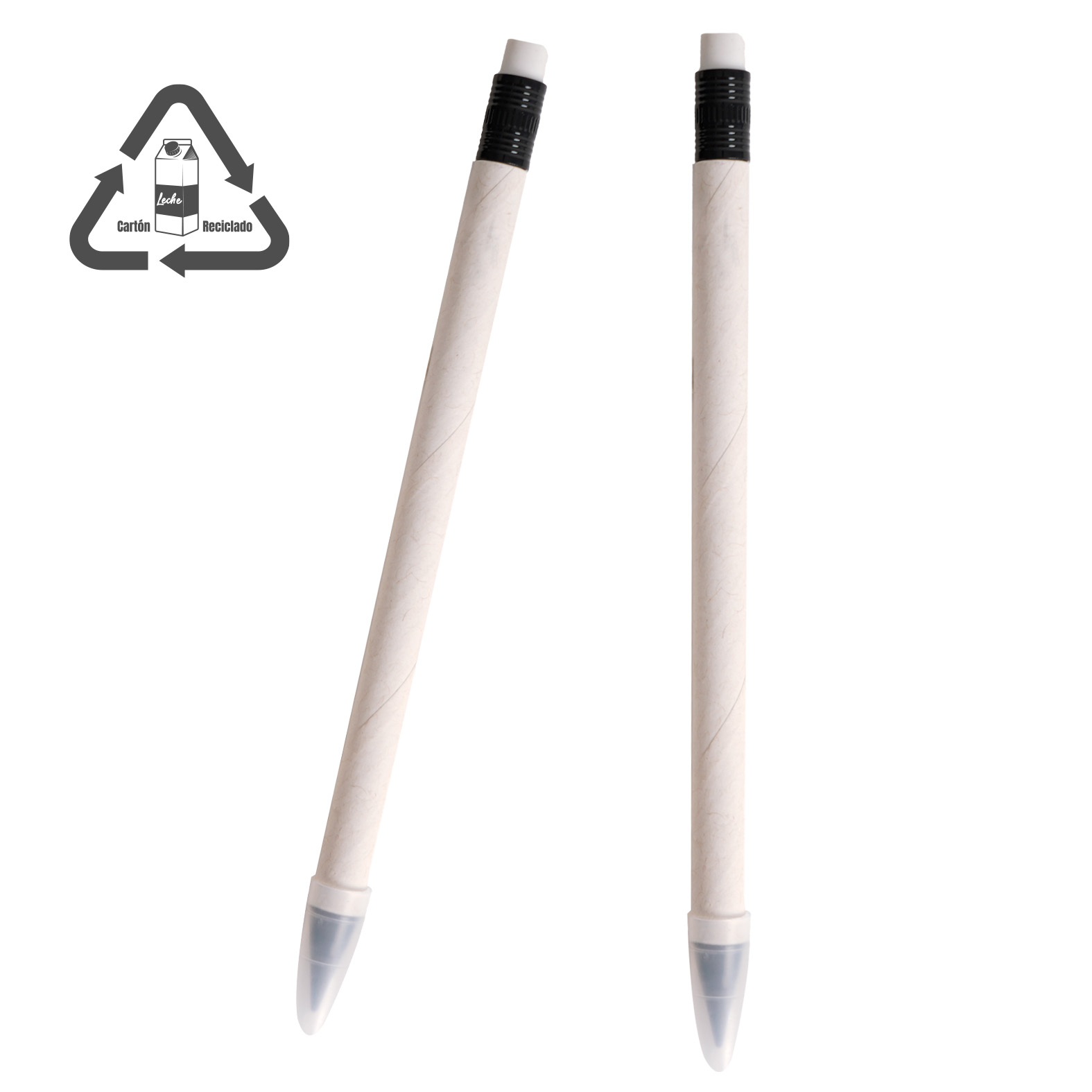 Bolígrafo ecológico fabricado a partir de cartones de leche reciclados. Su punta especial se oxida al contacto con el papel, permitiendo una escritura sostenible y duradera. Incluye una goma para mayor practicidad.