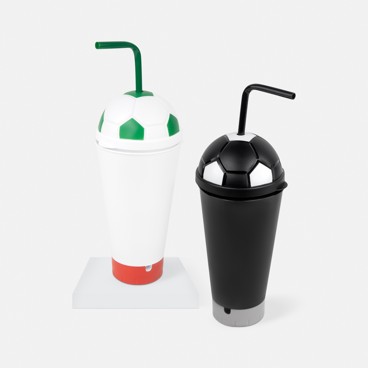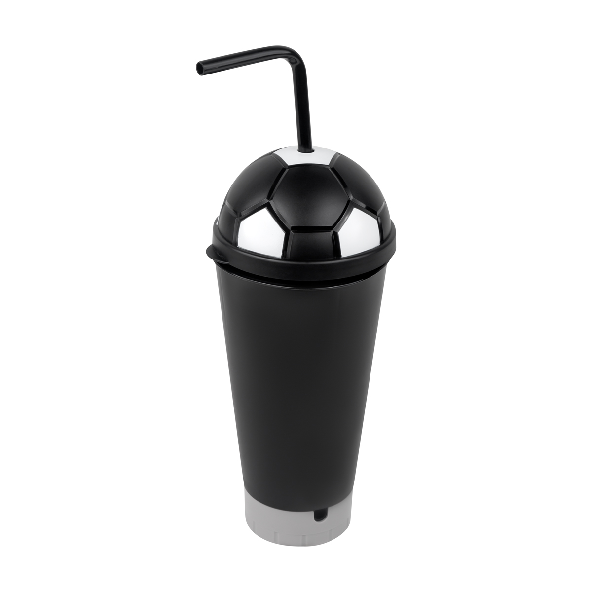¡Haz que cada evento se viva con la pasión del fútbol! Vaso doble pared de plástico equipado con una boquilla especial en la base que realiza la función de trompeta, ya sea utilizando el popote incluido o directamente con la boca, ideal para animar tus momentos favoritos. Tapa de plástico con sistema push y diseño en forma de balón. Popote reutilizable de plástico. Capacidad de 23 Oz. Base de 6.4 cm de diámetro. Incluye caja individual.