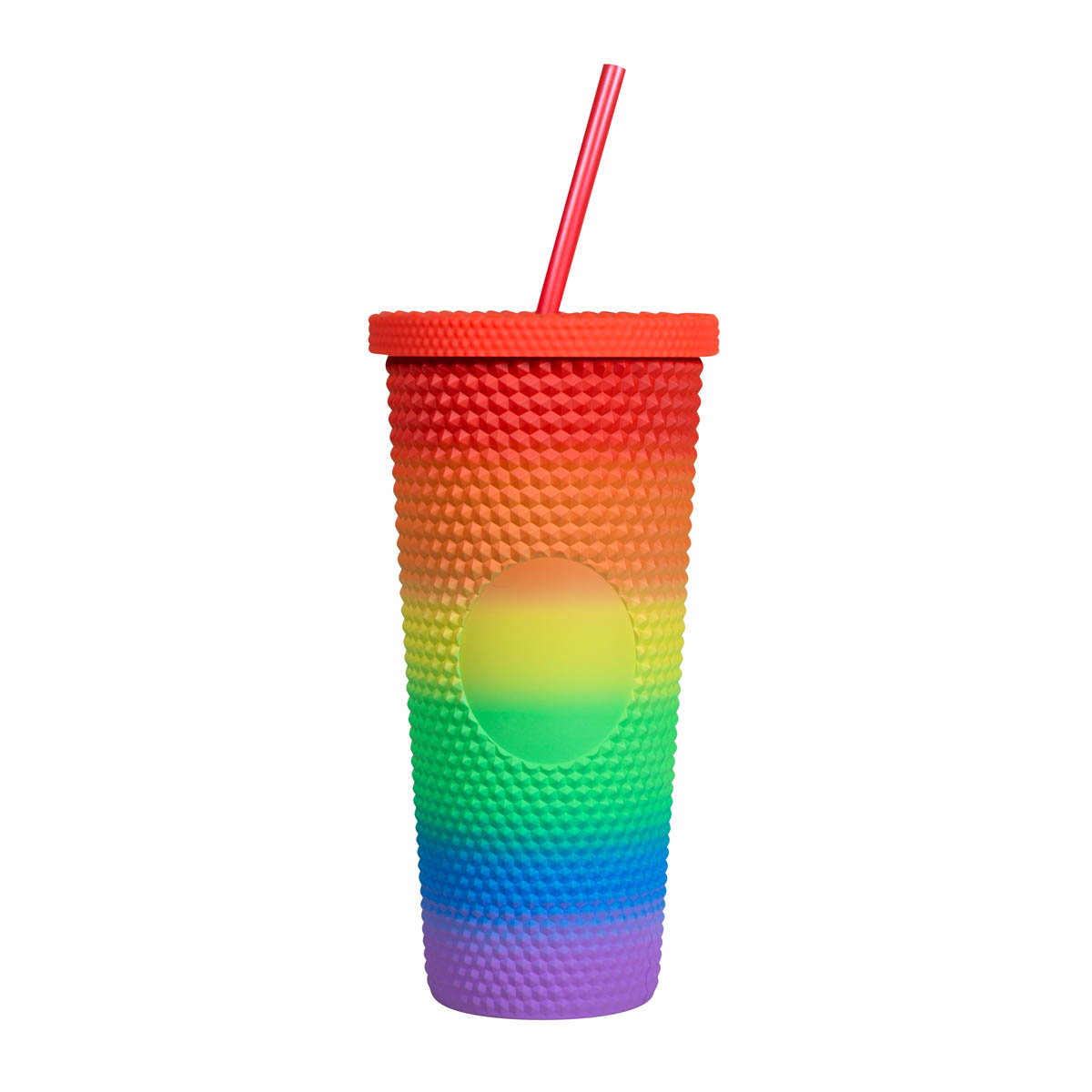 Doble pared. Pared interna y externa de plástico. Tapa de plástico con cierre de rosca. Terminado ruber y textura de picos. Capacidad 22 Oz. Base de 6.8 cm de diámetro. Incluye popote y caja individual.