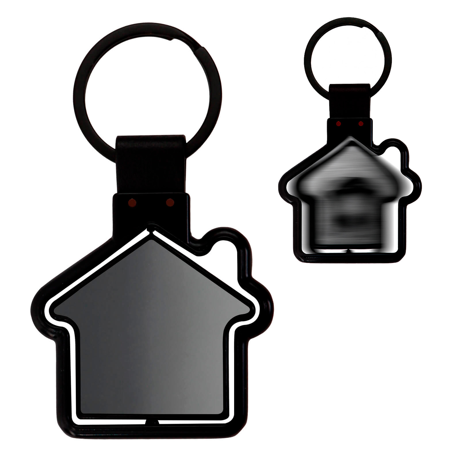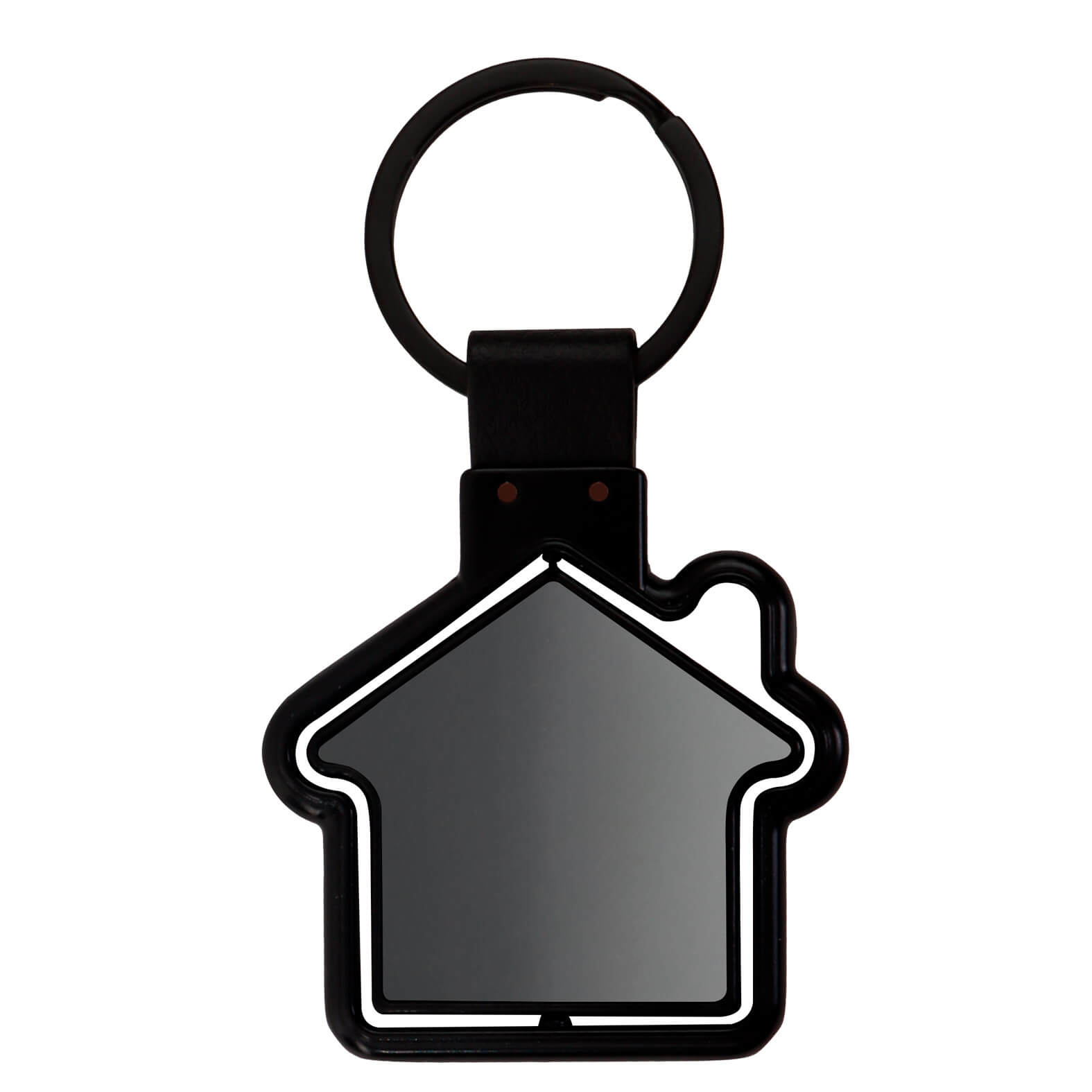 Llavero de metal en forma de casa con silueta girable y acabado espejo.