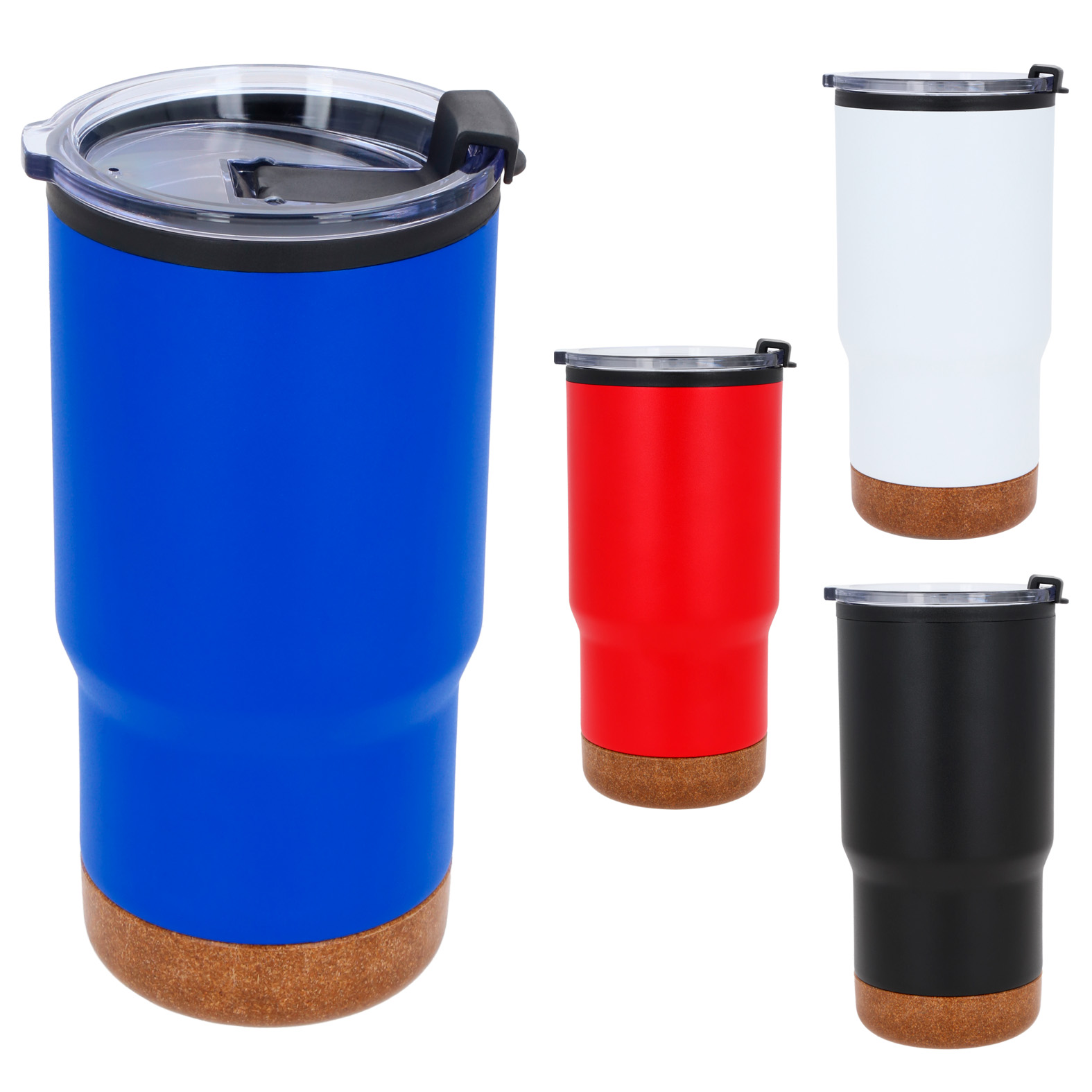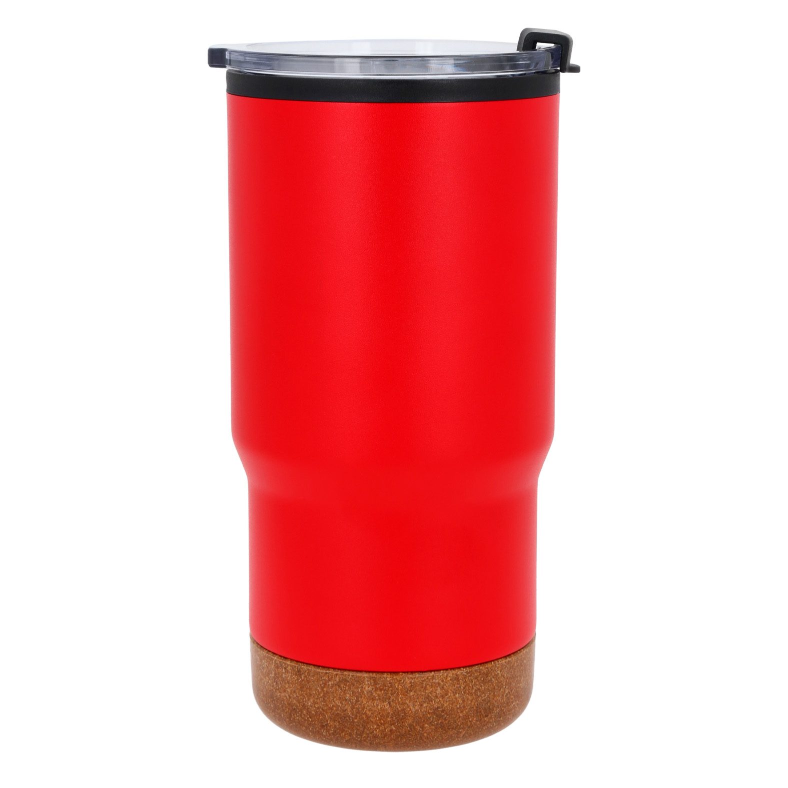 Termo de doble pared con acabado rugoso, exterior de acero inoxidable e interior de plástico, base de corcho y tapa de cierre a presión.