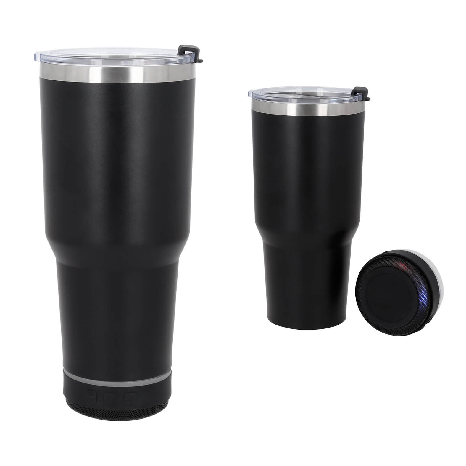 Termo con doble pared de acero inoxidable, insulado al vacío que cuenta con bocina bluetooth con controles de volumen, botón de reproducción, efectos de luz y micrófono para contestador de llamadas. Incluye cable tipo C. (La bocina es removible de la base del termo).