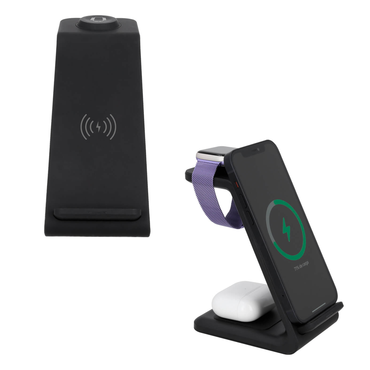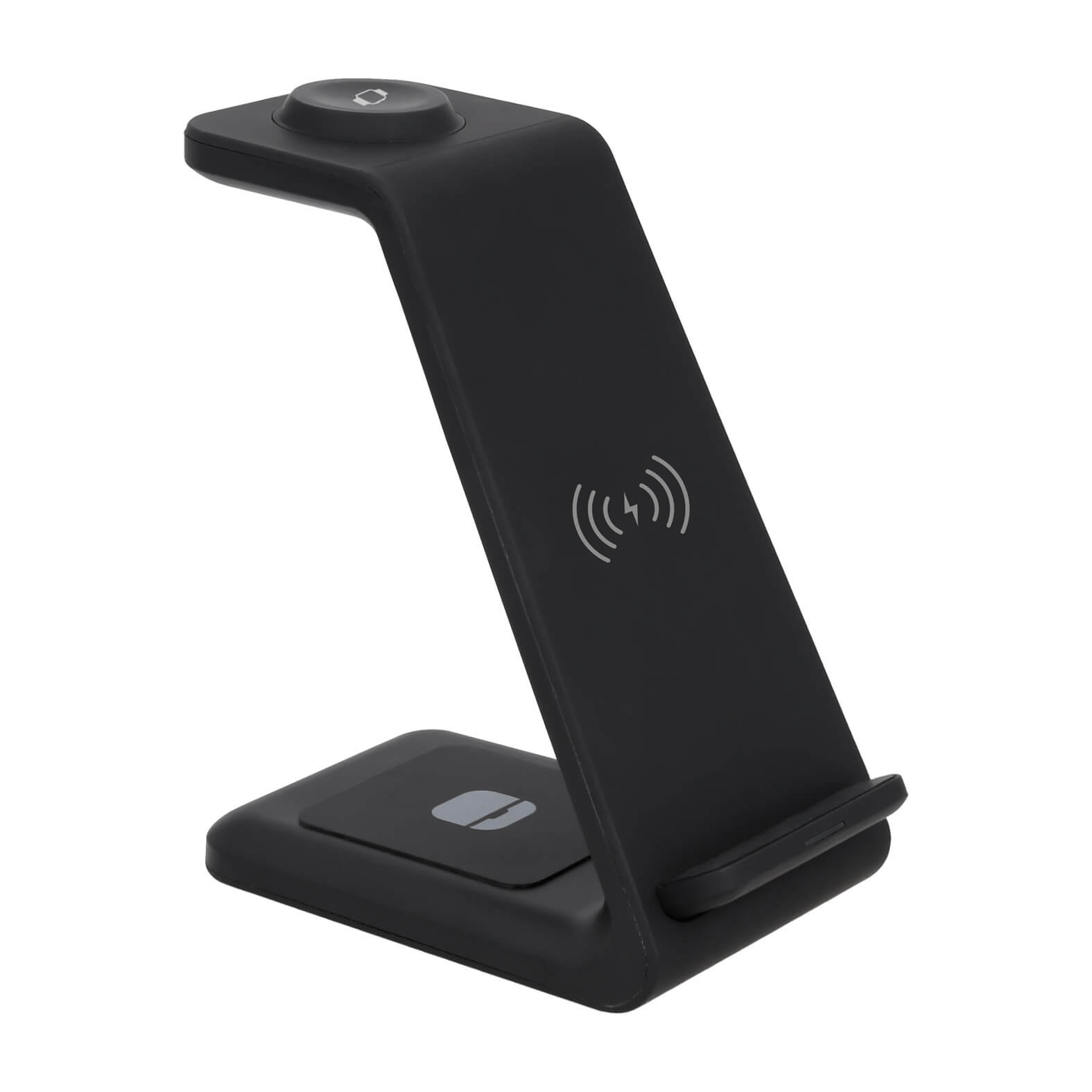 Wireless charger 3 en 1 para smartphone, audífonos y reloj inteligente. Incluye cable de carga tipo C. (Compatible para dispositivos con tecnología Qi).