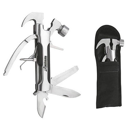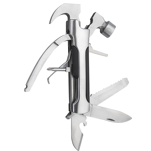 Martillo multiusos, contiene: pinzas, navaja, tijeras, desarmador, sierra, lima y destapador. Incluye funda.