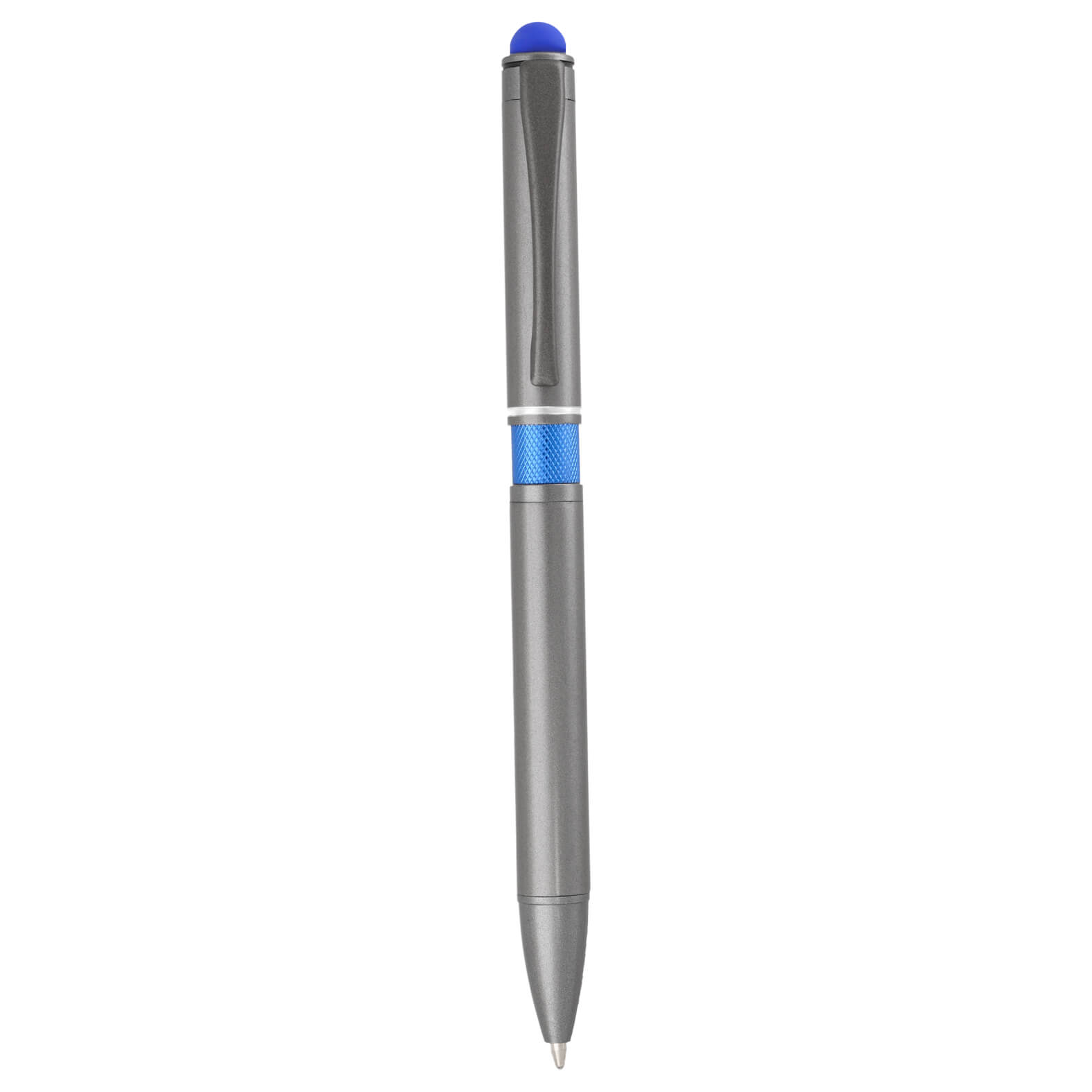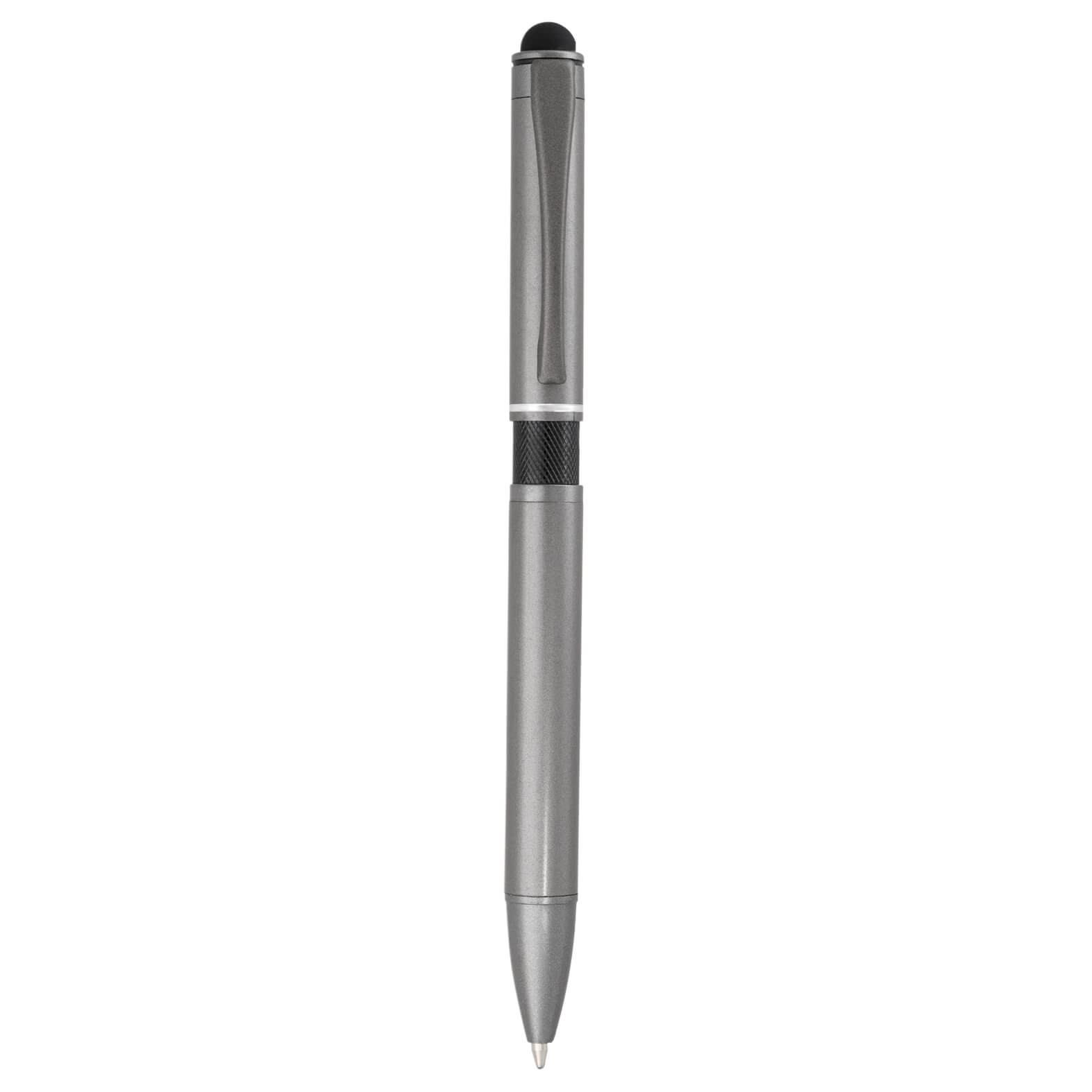 Bolígrafo metálico con detalle en el centro, clip, goma touch screen y mecanismo de click.